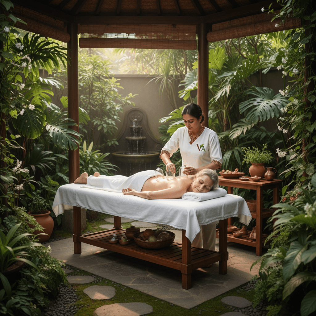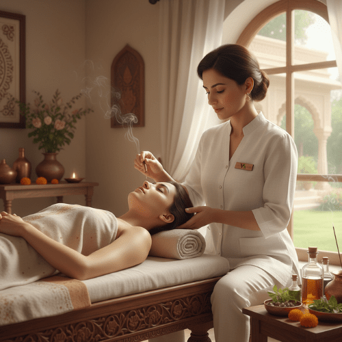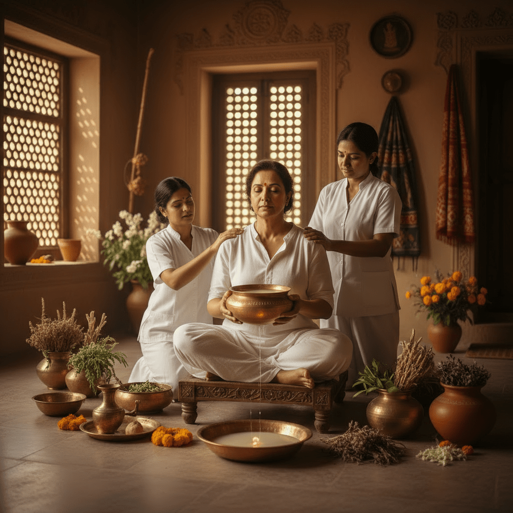 Warm herbal oil flows steadily on the forehead, calming the mind, easing stress, and restoring balance—Ayurveda’s ultimate reset